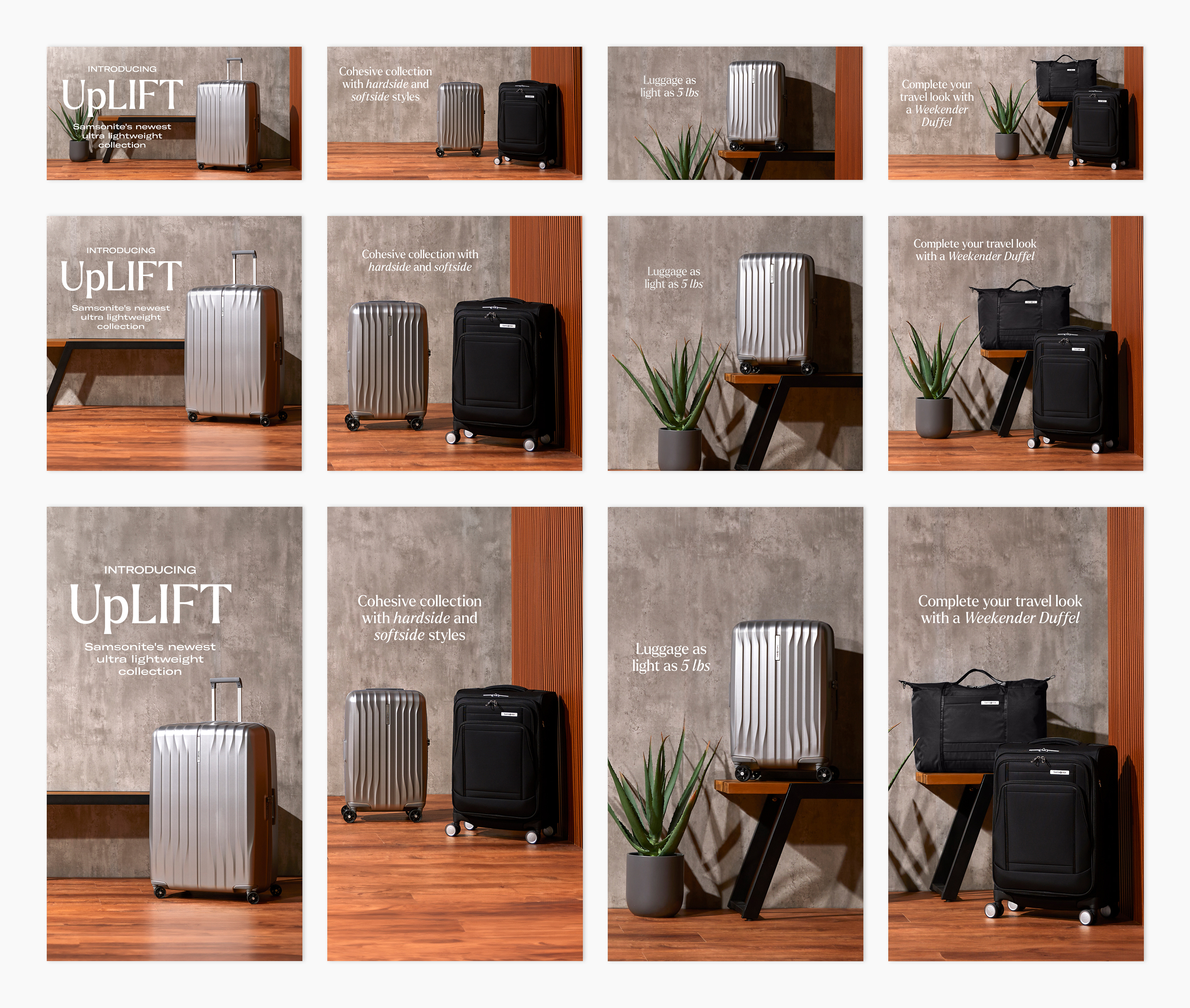 For Samsonite's UpLIFT collection launch, I got to play around with Adobe's built-in generative AI features to make it happen. I designed the layout and used Photoshop's Generative Fill to adapt it to different sizes while maintaining the brand's sophisticated aesthetic.